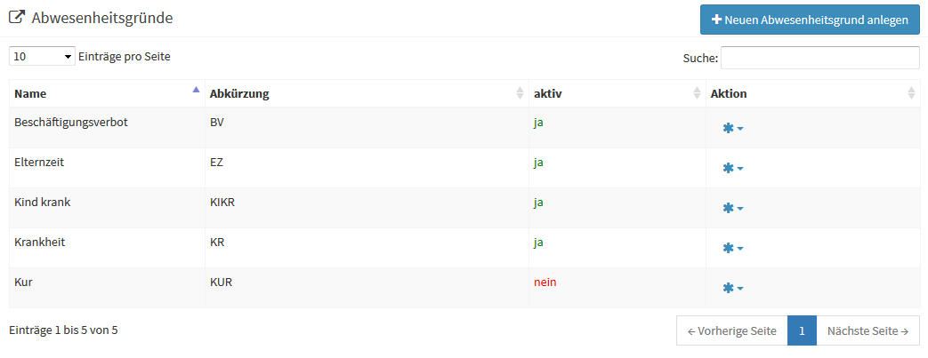 Hier können Sie Abwesenheitsgründe wie Krankheit, Elternzeit, Kur etc. hinzufügen und verändern. Sie können ebenfalls deaktiviert werden, wenn sie für Mitarbeiter nicht mehr auswählbar sein sollen.