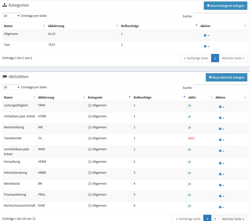 Hier können Sie die Aktivitäten verwalten, aus denen die Mitarbeiter auswählen können, wenn sie ihre Anwesenheitszeiten eintragen. Jede Aktivität gehört einer Kategorie an, die Sie ebenfalls verwalten können. Beispielsweise könnte eine Aktivität "Rechnungsprüfung" der Kategorie "Verwaltung" angehören. Aktivitäten können deaktiviert werden, wenn sie für Mitarbeiter nicht mehr auswählbar sein sollen.