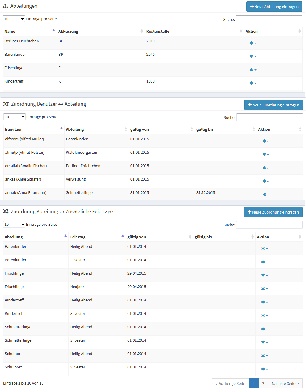 Für jeden Bereich müssen Sie folgende Angaben machen: Name, Abkürzung, Kostenstelle (optional), Land und Bundesland. Durch Angabe des Landes und des Bundeslandes können die gesetzlichen Feiertage berücksichtigt werden. Außerdem können Sie für jeden Bereich zusätzliche Feiertage speichern, beispielsweise Heilig Abend. Das geschieht wieder unter Angabe eines Gültigkeitszeitraums mit gegebenenfalls offenem Ende.