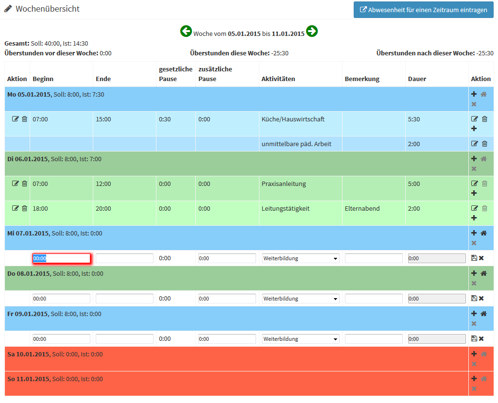 Für jeden Tag tragen Sie einen oder mehrere Stundenblöcke ein, mit jeweils mindestens einer Aktivität.