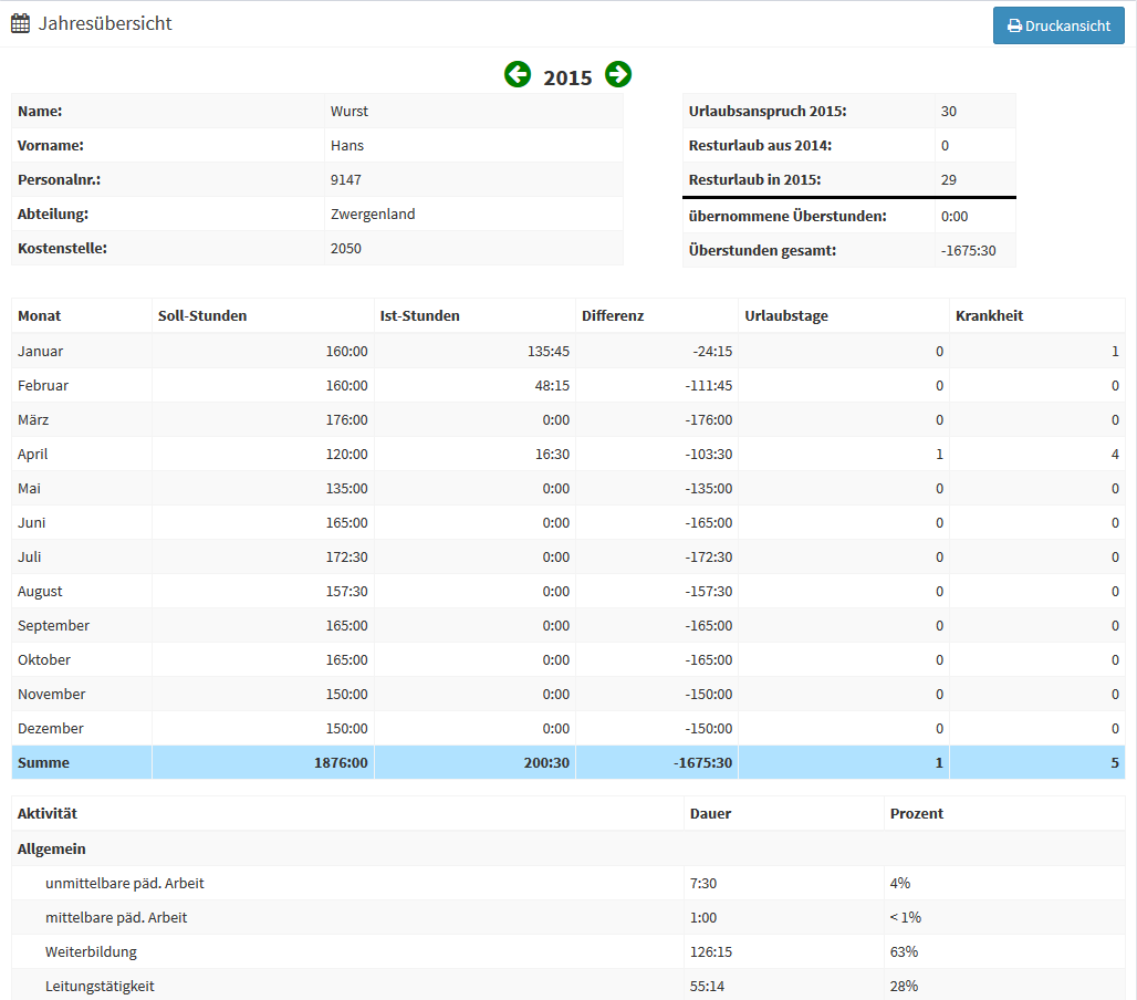 • sich in der Monats- und Jahresübersicht jedes Mitarbeiters einen Überblick verschaffen über geleistete Stunden, Aktivitäten, Urlaubstage etc.