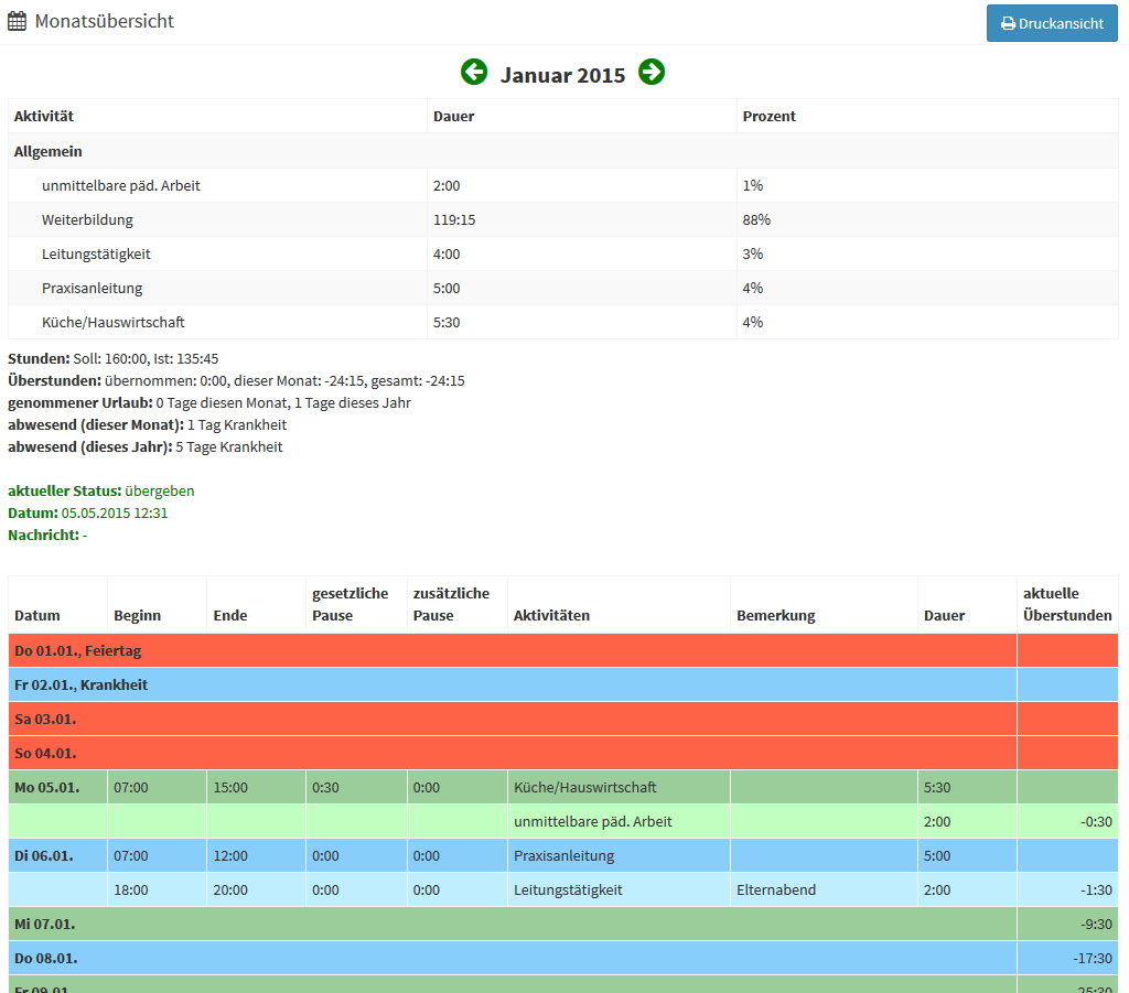 • sich in der Monats- und Jahresübersicht einen Überblick verschaffen über geleistete Stunden, Aktivitäten, Urlaubstage etc.