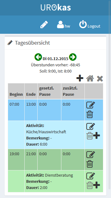 Für jeden Stundenblock geben Sie Beginn, Ende und zusätzliche Pause an. Die gesetzliche Pause wird automatisch eingetragen. Für jede Tätigkeit führen Sie Aktivität, Bemerkung (optional) und Dauer an.