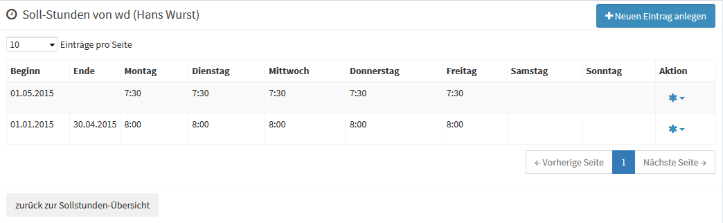 Zum Beispiel: Mitarbeiter Hans Wurst, Zeitraum: 01.01.2015 - offenes Ende, Montag bis Freitag jeweils 8 Stunden