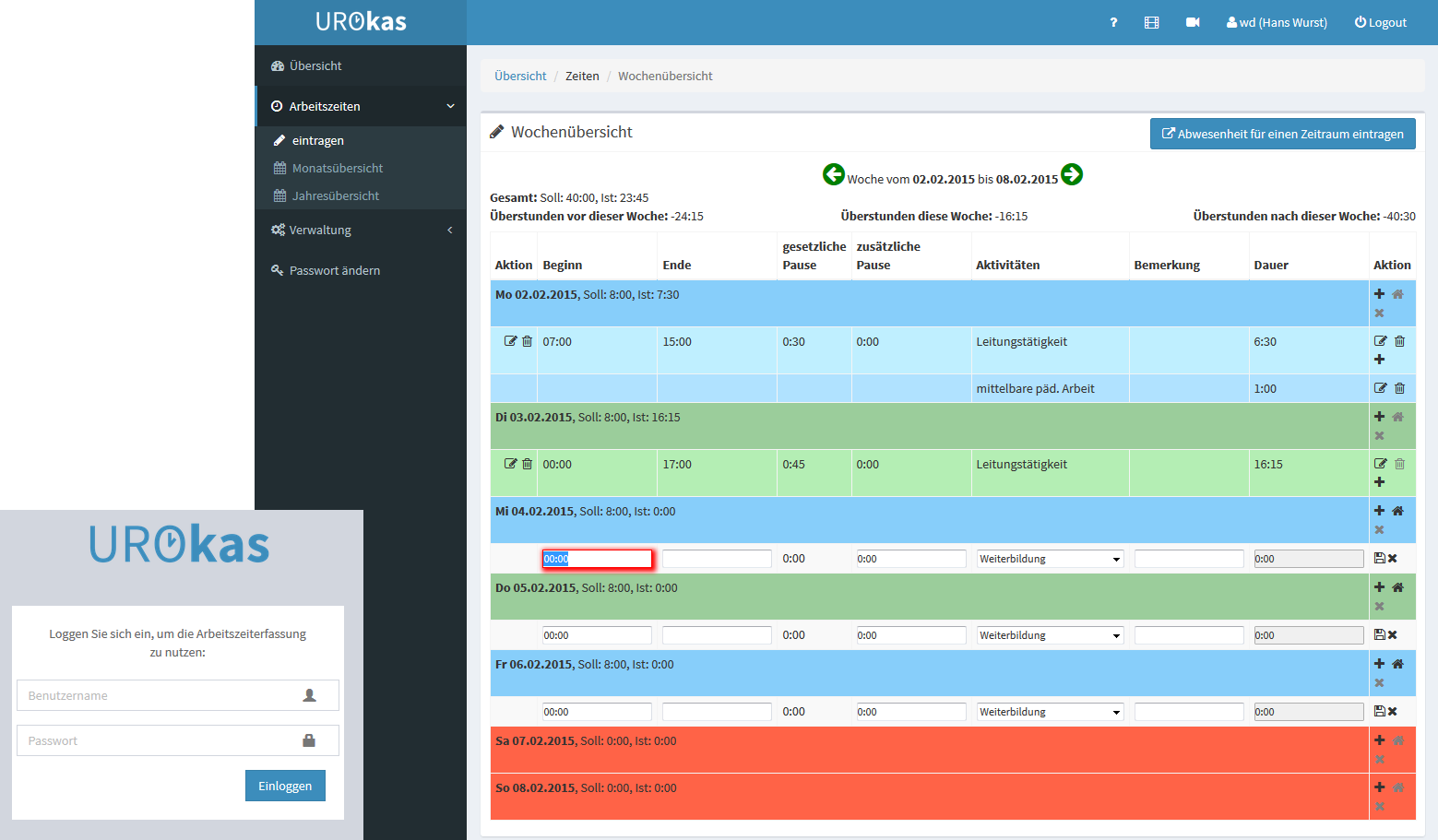 • alles verwalten: Benutzer, Aktivitäten/Tätigkeiten, Bereiche (Abteilungen), Vorgesetzte, Urlaubsansprüche, Sollstunden, Abwesenheitsgründe